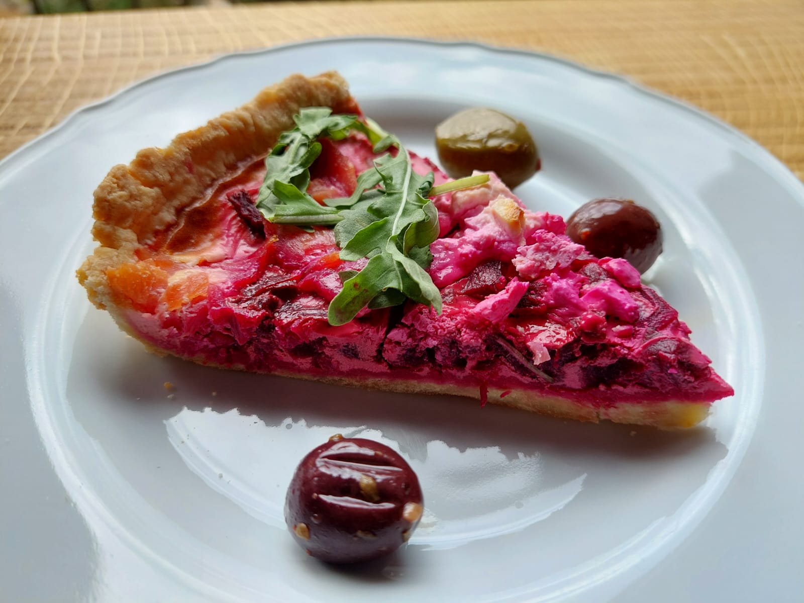 To kolejny sprawdzony przepis na wytrawną tartę. Łączy smak buraczka ze słoną fetą oraz wędzonym łososiem, wszystko podane na kruchym spodzie, można dodać pesto. Dooobre!