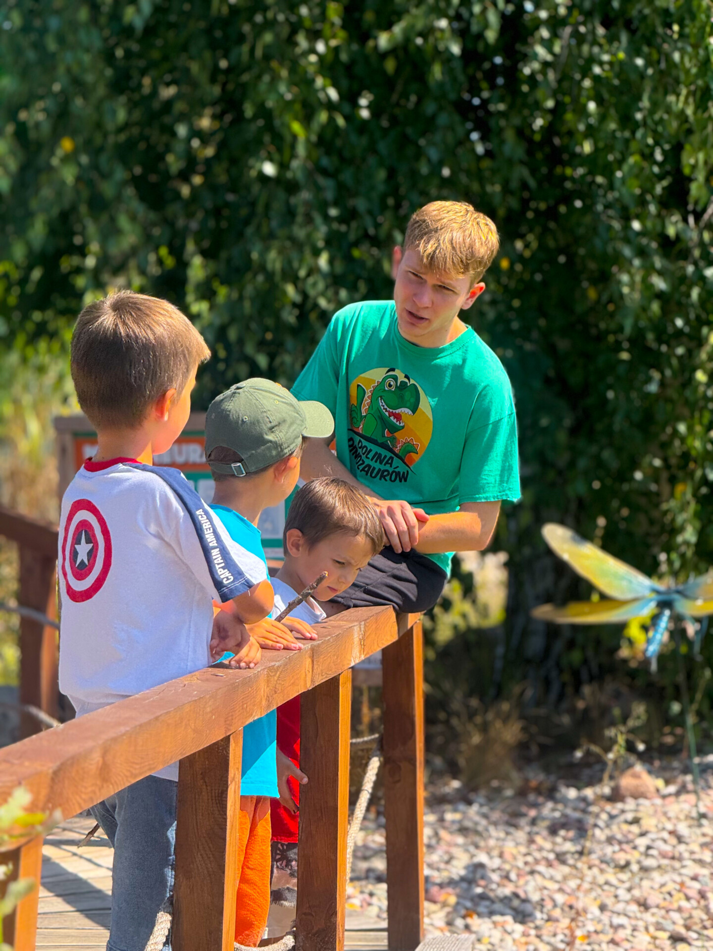- Edukacja w terenie (Dino-Lab): zamiast teorii – praktyka. Pod okiem instruktorów dzieci wcielają się w paleontologów, odkopując szkielety dinozaurów w wielkiej piaskownicy archeologicznej.